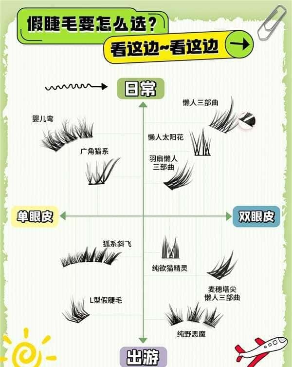 Comparado à pálpebra simples, pessoas com pálpebra dupla têm uma escolha mais fácil de cílios postiços, pois a maioria dos modelos se adapta bem a esse tipo de olho. Para maquiagem leve do dia a dia, podem usar a trilogia preguiçosa, girassol preguiçoso ou leque de penas da trilogia preguiçosa. Para passeios ou ocasiões mais elaboradas, podem optar por modelos mais evidentes como o pequeno demônio selvagem ou o espírito felino puro.